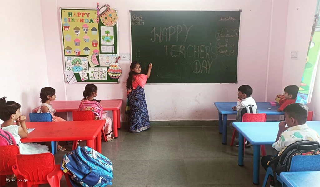 10. Teacher Day celebration.Teacher’s day was celebrated on 05 Sep 24. All the students came school dressed up like teachers and practice to teach in class. At the time of departure, chocolates will the distributed to all the students.